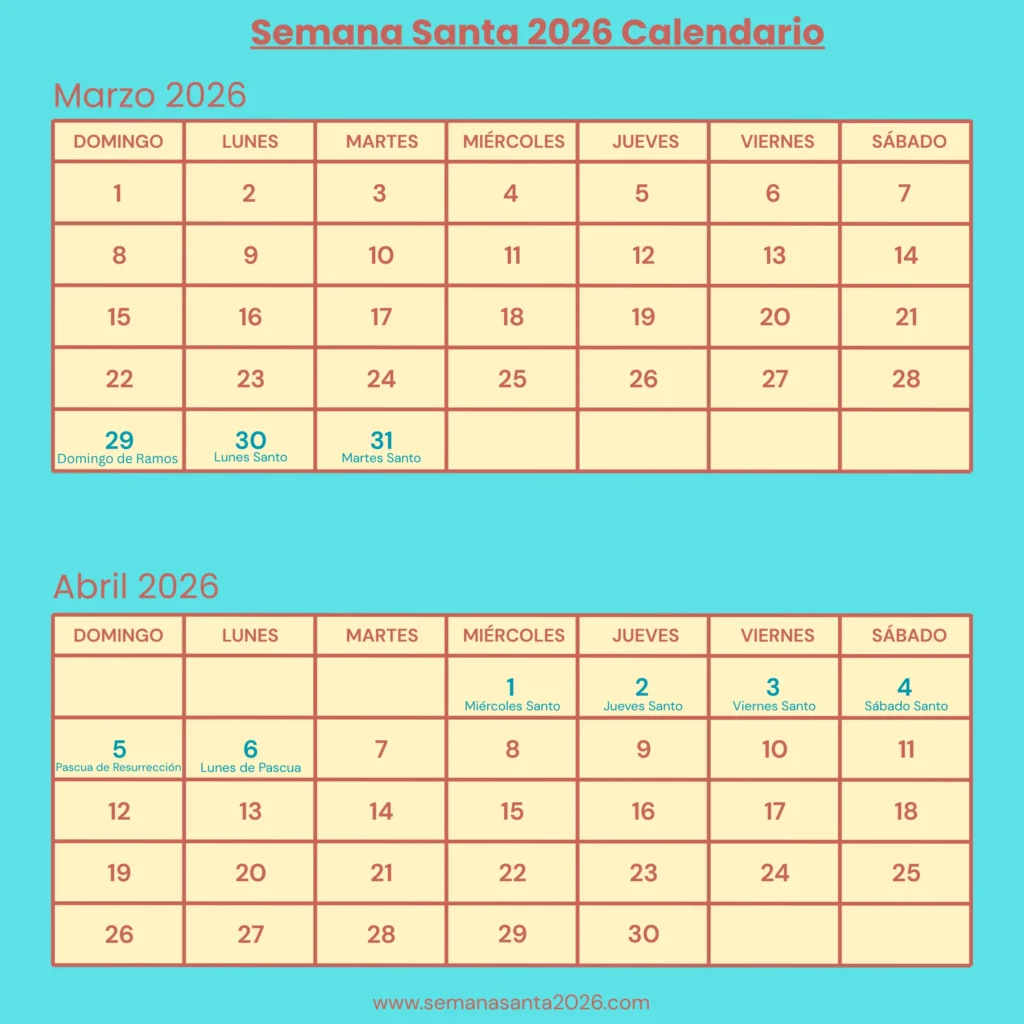 Palabras clave: Semana Santa 2026, Calendario de la Semana Santa, Pascua 2026, Domingo de Ramos, Viernes Santo, Domingo de Resurrección, Cuaresma, fe cristiana.